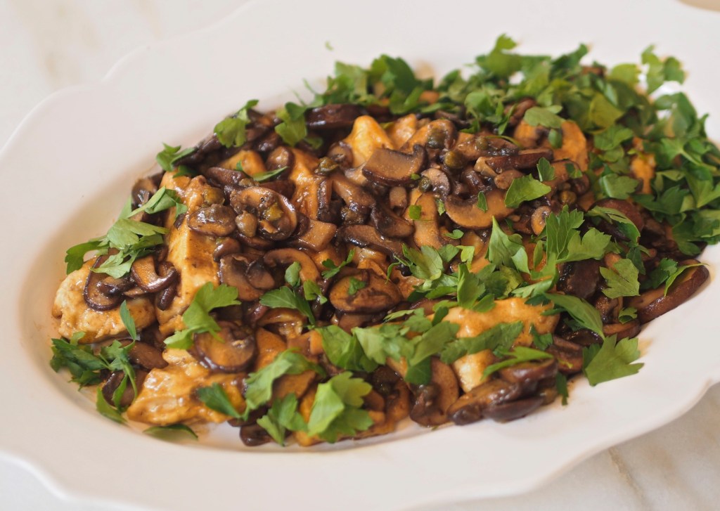 – Using the tongs, again transfer chicken pieces to the serving platter. Place the mushrooms on and around the chicken. Garnish with parsley and serve, yum!