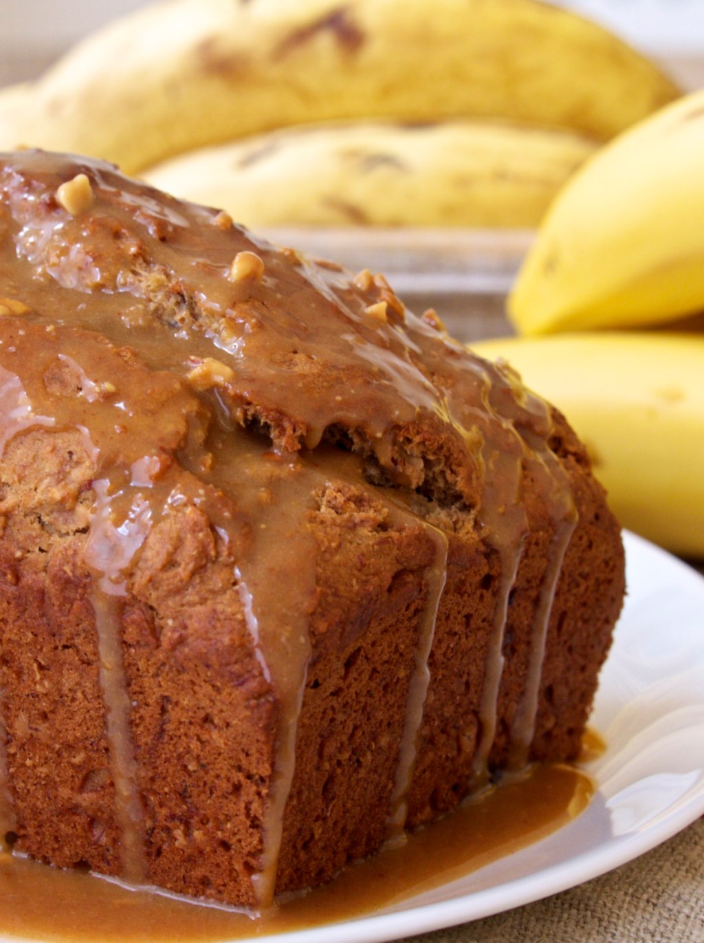 • When finished baking, cool the banana bread for 15 minutes, then slowly drizzle with glaze.  Allow 10-15 minutes for glaze to set before slicing.